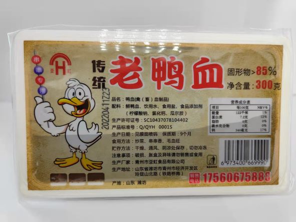 青州市亚虹食品有限公司,成立于2019年。公司主要从事熟制鸭血的研发、生产、销售,产品销售遍布全国各省一级农贸批发市场。我们的管理团队,拥有该行业十几年的生产制造经验,以保证产品质量的安全稳定性。