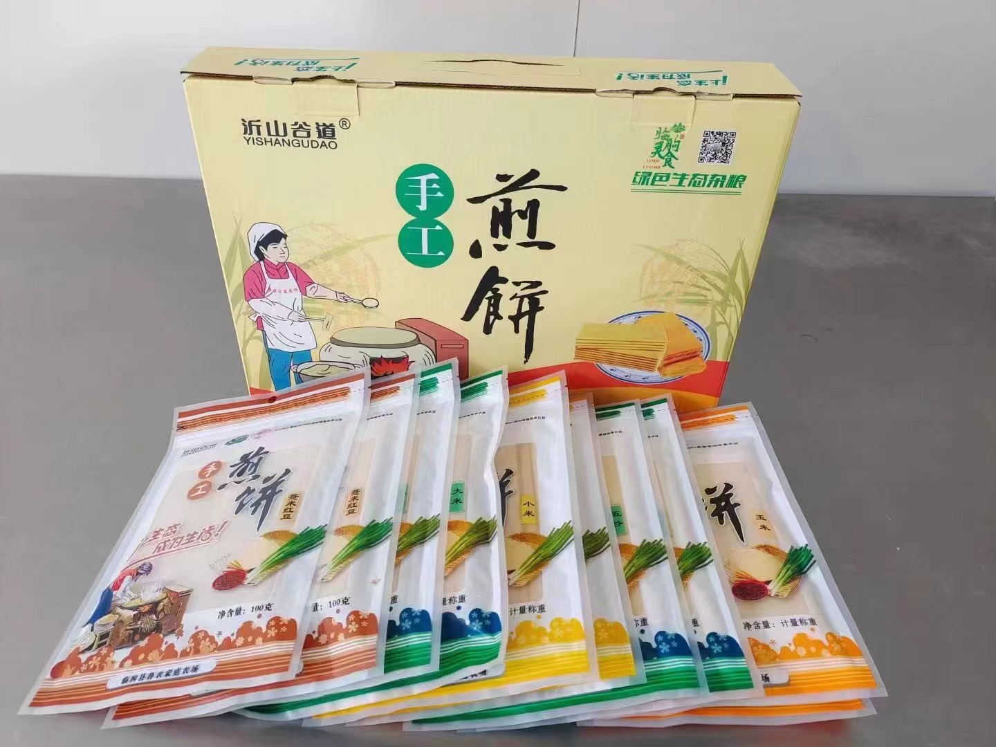 临朐煎饼是山东临朐县特色传统名吃,创制年代无考,明代已成家常便饭。以玉米、高粱、小米、地瓜干等粗粮为原料,我们辛寨街道的“沂山谷道”手工煎饼有自己的绿色生态种植基地临朐县鲁农家庭农场种植小米(已申请绿色食品)高粱等杂粮为原料,在传统工艺的基础上加以改进改良,煎饼加工全过程选用PH值7.8左右的苏打水,低温冷发酵(解决胃肠不好吃了煎饼反胃不好消化的问题),原粮蒸熟,石磨磨糊,纯手工火炉鏊子摊制。加工全过程禁用防腐剂和糖等添加剂,加工出的煎饼薄如纸,入口即化,柔软香甜,选用食品级可接触包装开袋即食!非常方便!
